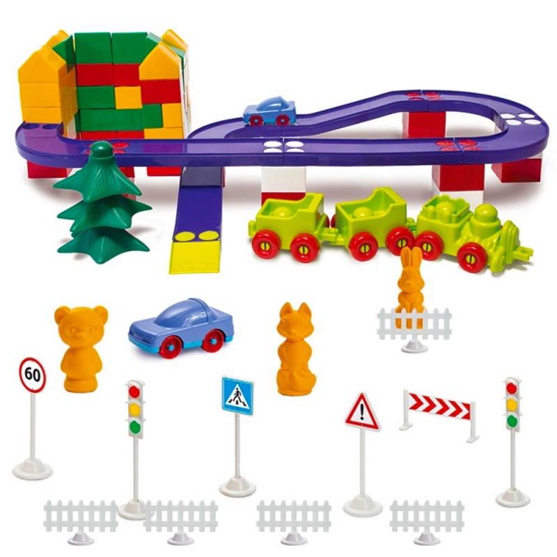 Набор очень большой: блоки разной формы и цвета, легко соединяющиеся в замысловатые строения, составные элементы дороги и знаки дорожного движения, легковые машинки и паровозик, а также заборчики, деревья и даже фигурки зверят — все продумано для того, чтобы малыш, собирая конструктор, освоил новые навыки конструирования и получил представление о форме, цвете и объеме окружающих предметов.